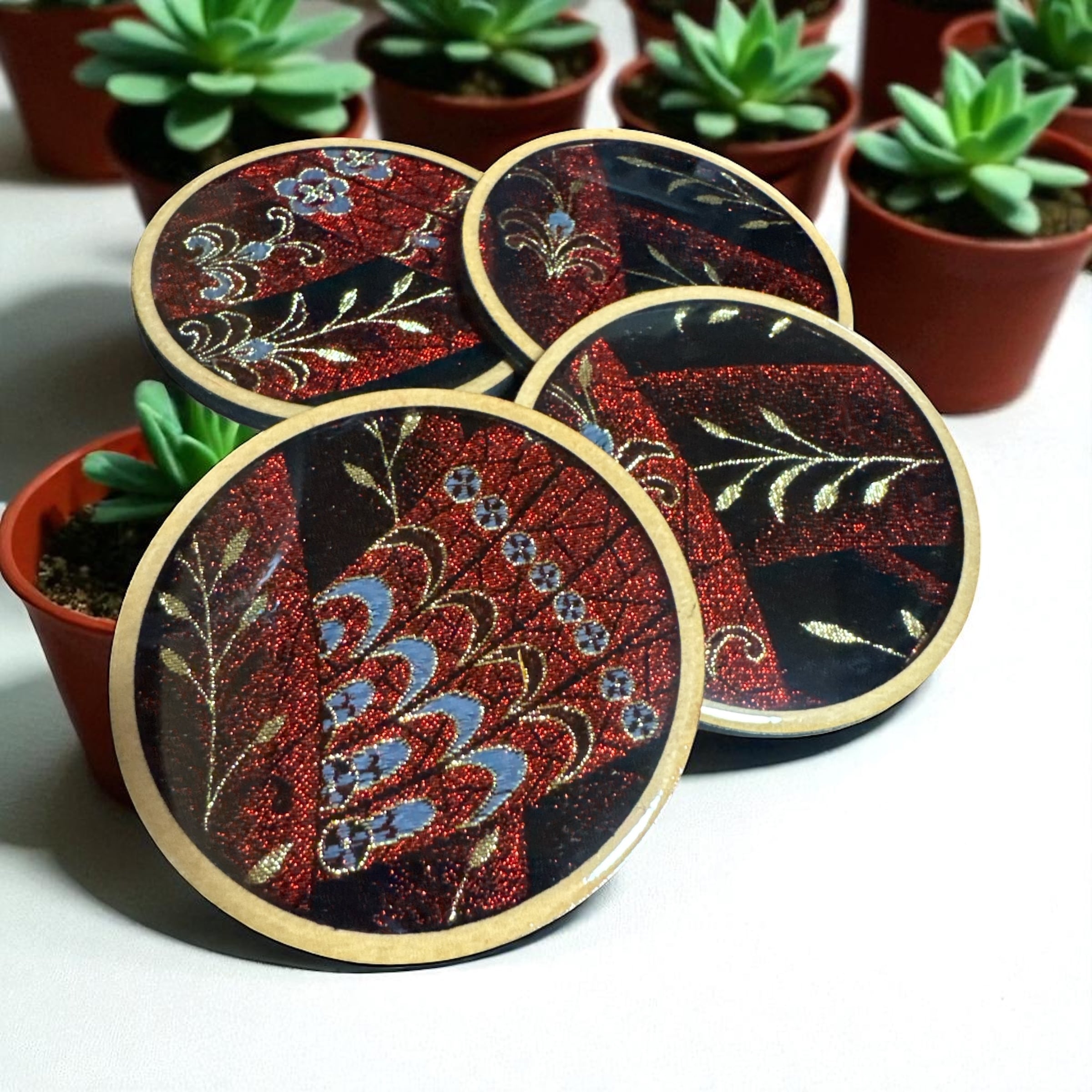こちらは、西陣織の美しい技術が表現された「西陣織 コースター 孔雀の羽 赤」です!豪華な孔雀の羽の柄が目を引くこのコースターは、特別な時間を彩るアイテムとして最適です。手に取ると、その柔らかな質感と熟練の職人による丁寧な仕上げが実感でき、日々の生活をリッチなものにしてくれます。サイズは9.5cmで、カップやグラスをしっかり支え、さりげなくインテリアに溶け込むデザインです。