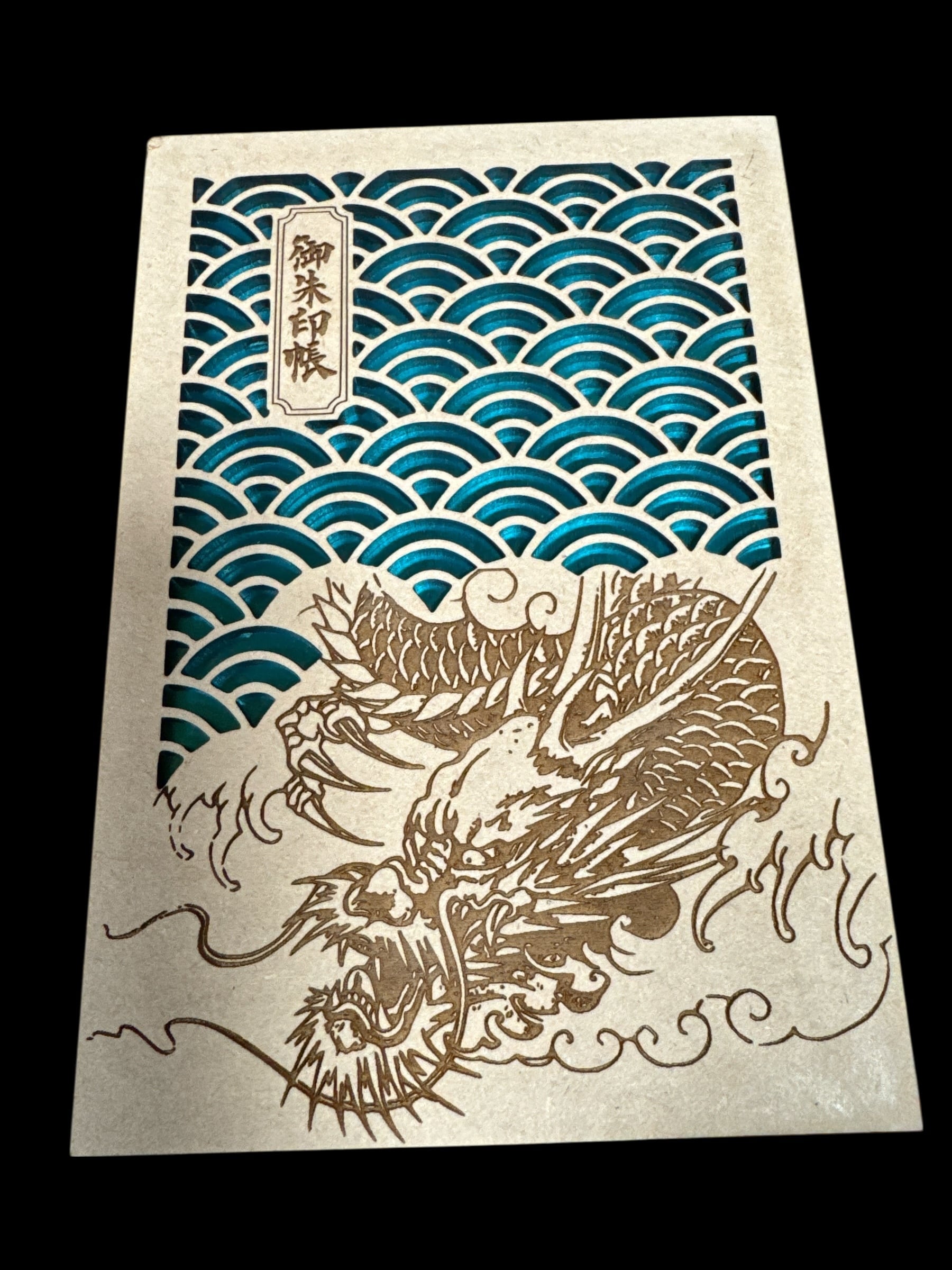 こちらは、神秘的な美しさを持つ「木製透かし 御朱印帳 龍 メタリックブルー」です!青いメタリックの輝きと、力強い龍の透かし模様が融合したデザインが特徴です。サイズは縦16cm、横11cmで、持ち運びにも便利です。大切な御朱印を優雅に保管するための特別なアイテムとなります。